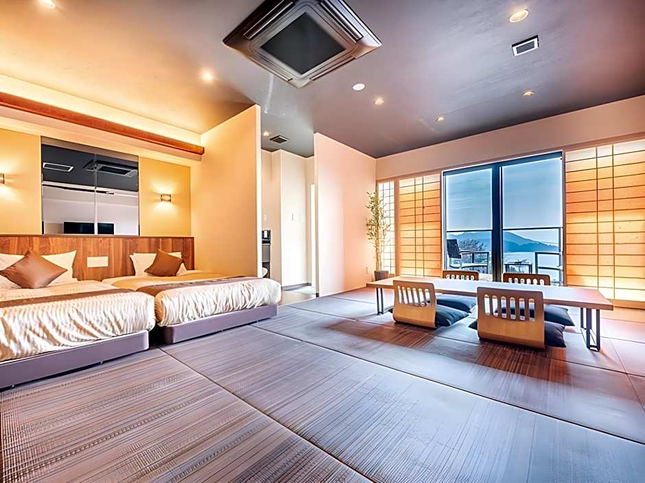 Guests will have a special experience as this suite offers a pool with a view, a hot tub and a private open-air bath. This spacious suite consists of 1 living room, 1 separate bedroom and 1 bathroom with a walk-in shower and free toiletries. The air-conditioned suite provides a flat-screen TV with satellite channels, tatami, a tea and coffee maker, a wardrobe as well as sea views. The unit offers 2 beds and 2 futons.